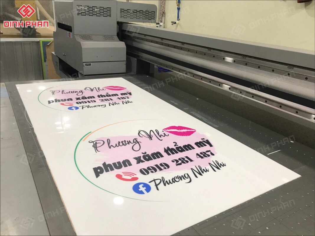 In UV mica sử dụng máy in UV phẳng chuyên dụng, với mực in UV cao cấp và mực in được sấy khô ngay sau đó bằng tia UV.